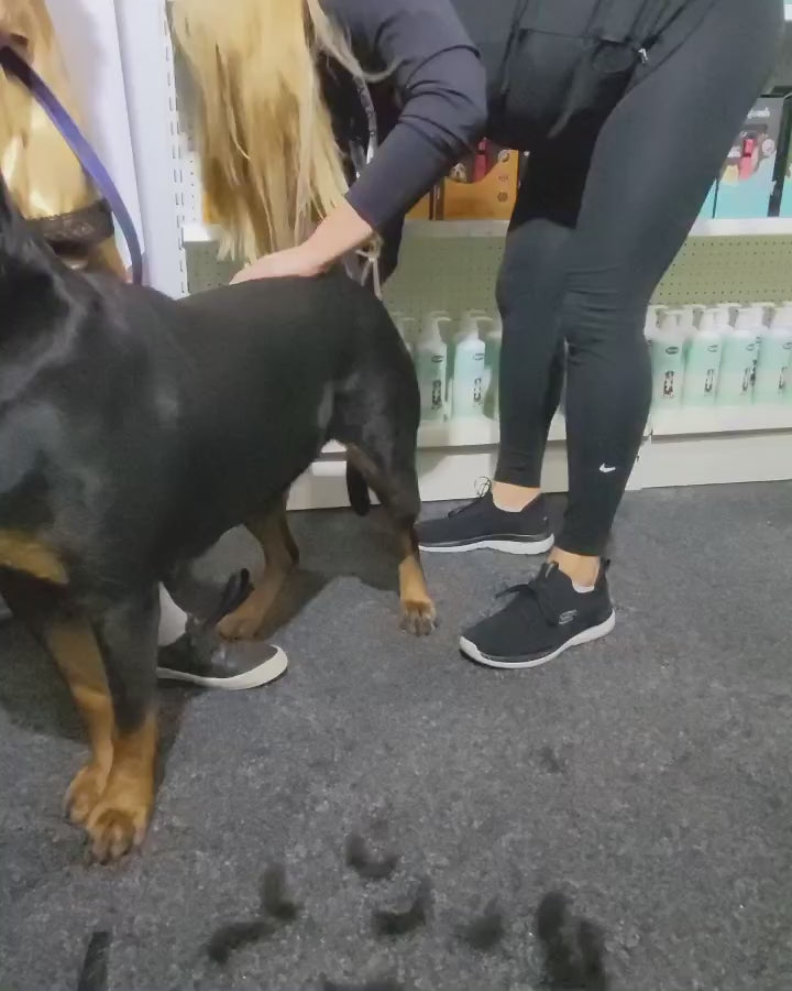 The best brush for a Rottweiler is a good quality deshedding tool like the Refuresh that targets their short double coat and loosens undercoat hair without damaging the topcoat. This helps distribute natural oils and keeps their coat looking and feeling smooth and shiny.